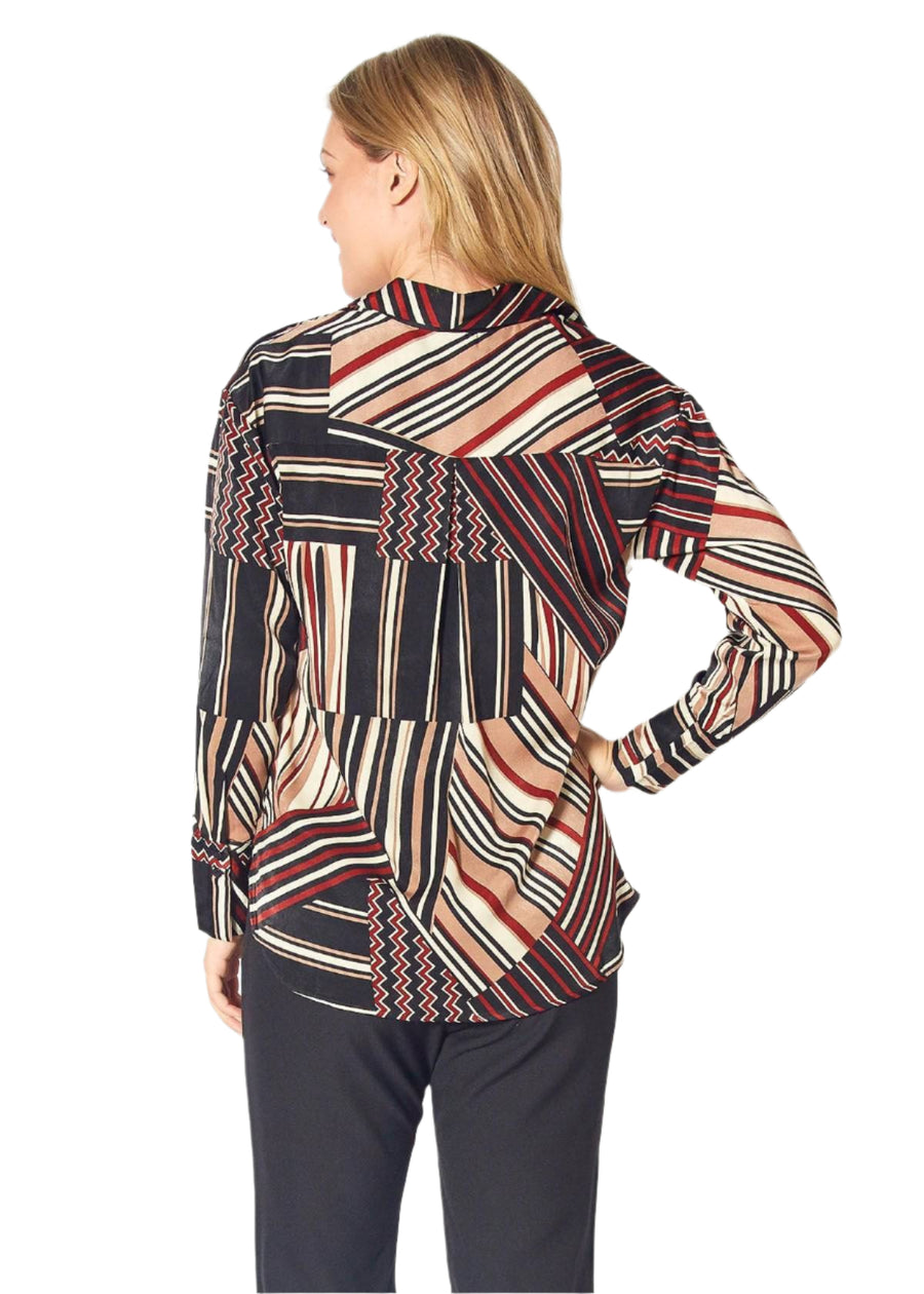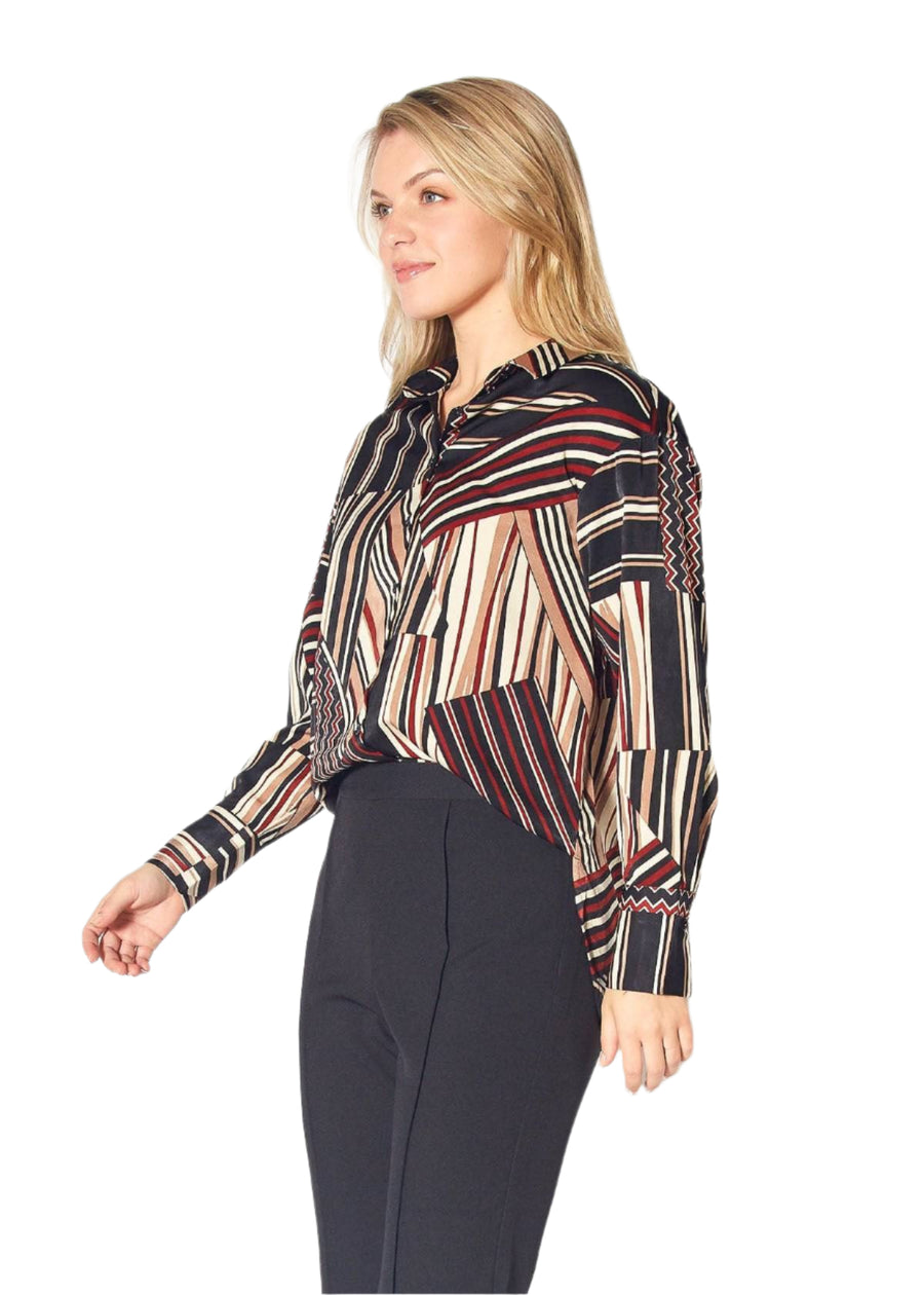This blouse features a multi-colored stripe design and a button-up collared shirt style.