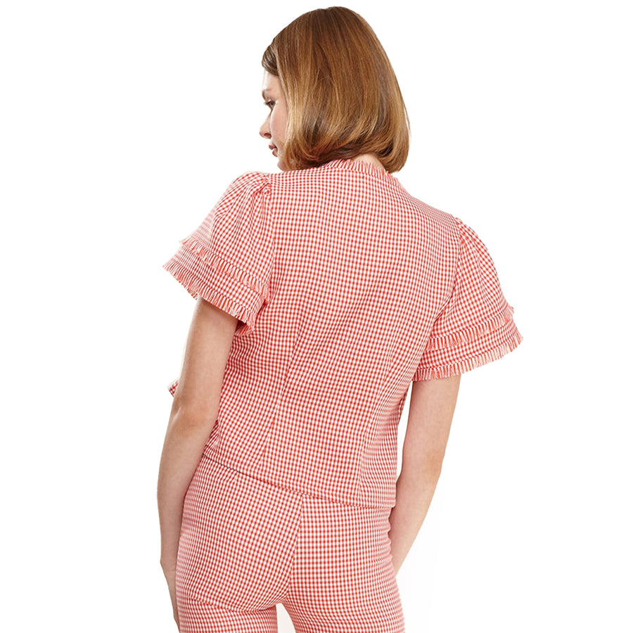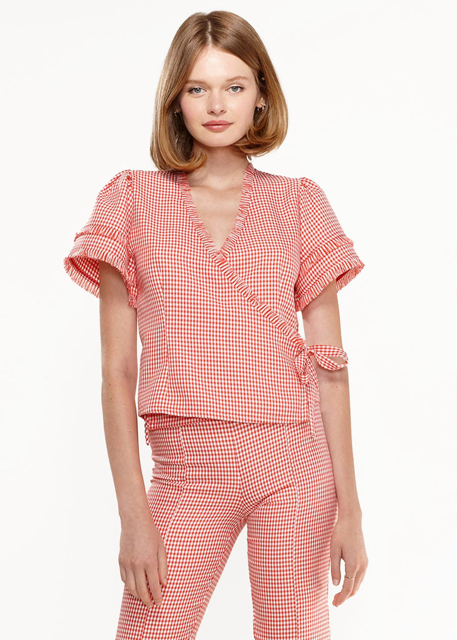 Women's Fringe Trim Gingham Wrap Blouse In Red Gingham