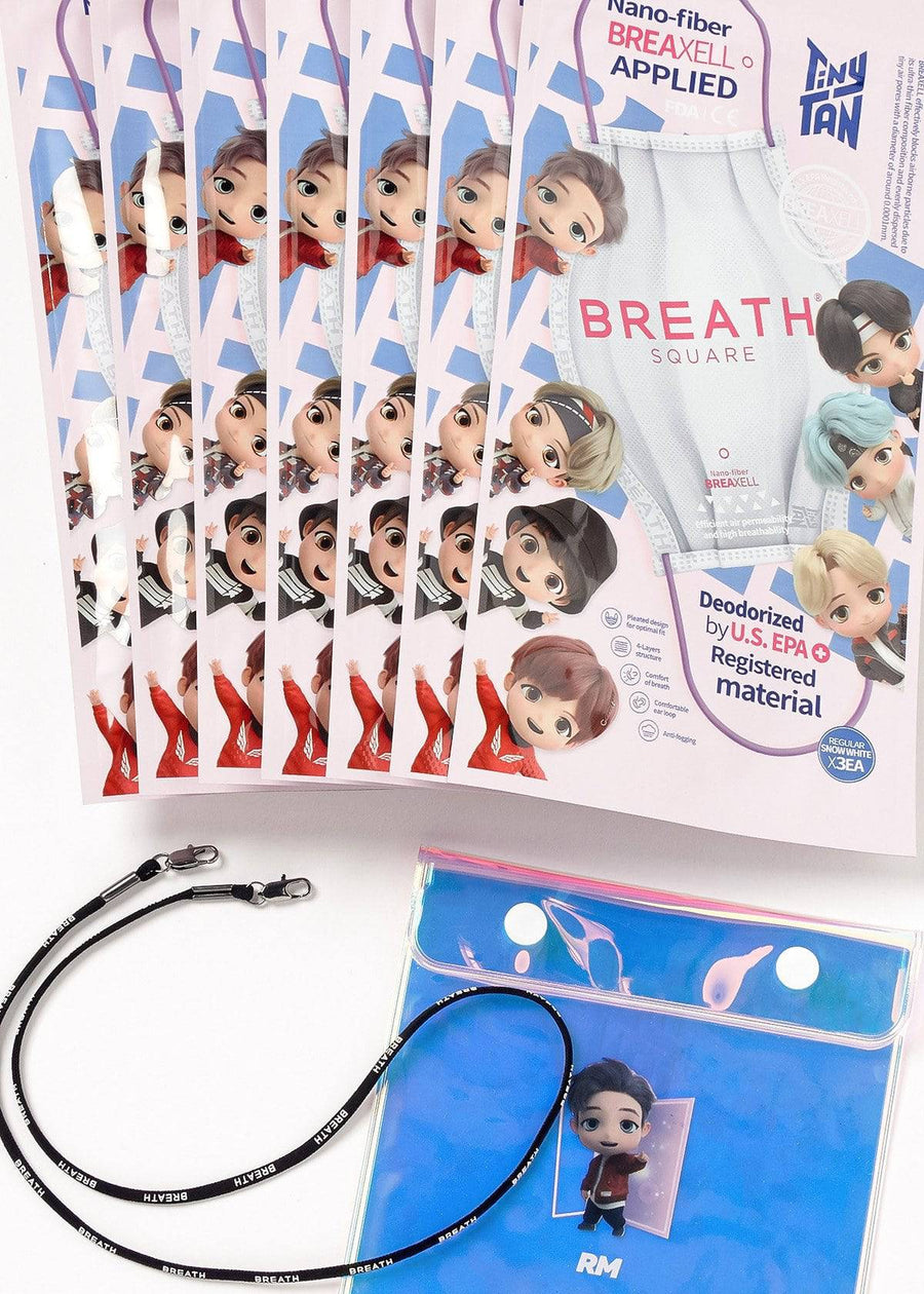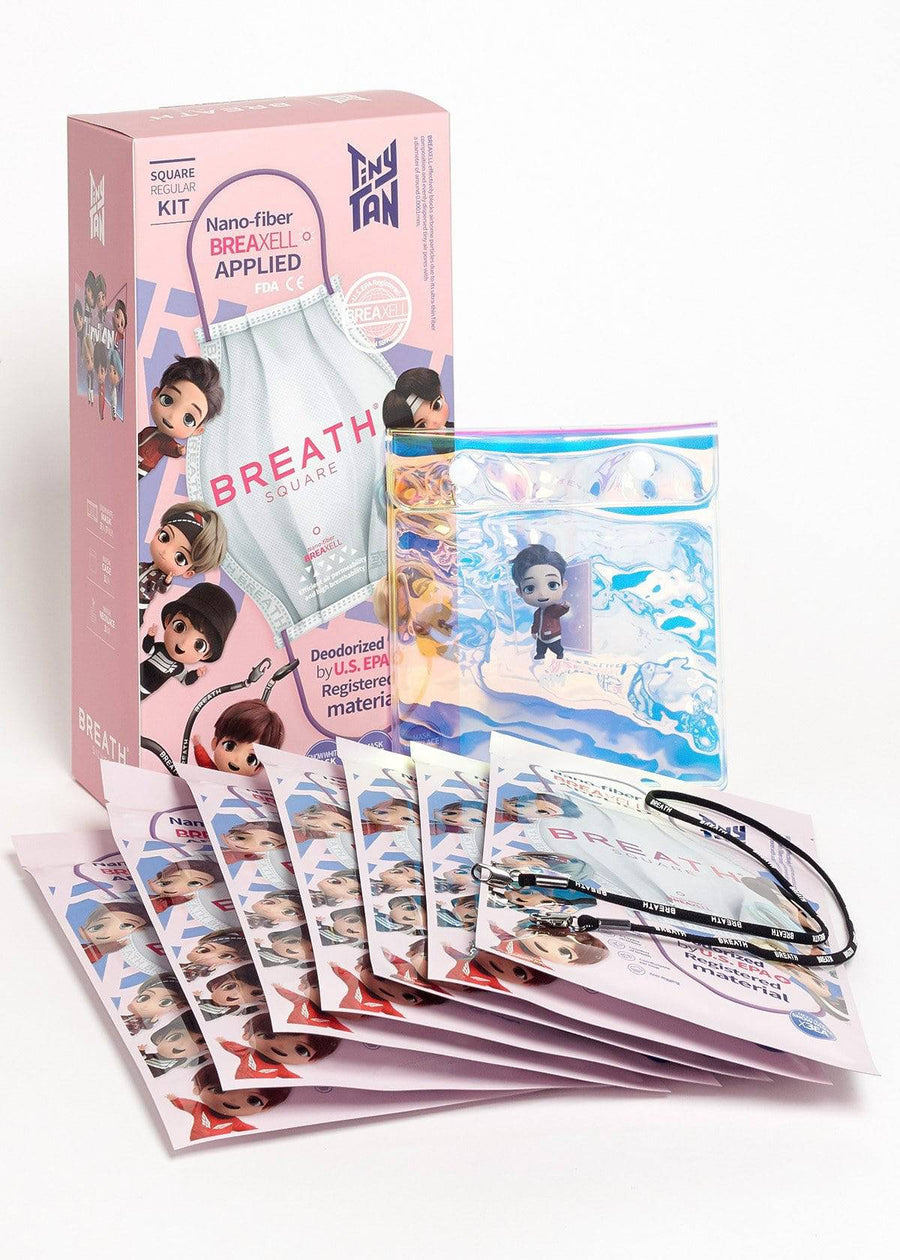 The Breath Square mask regular kit is a BREATH SILVER edition that contains 7 packs of masks (3 masks per pack), 1 essential mask case (random select BTS member) and 1 essential mask necklace.