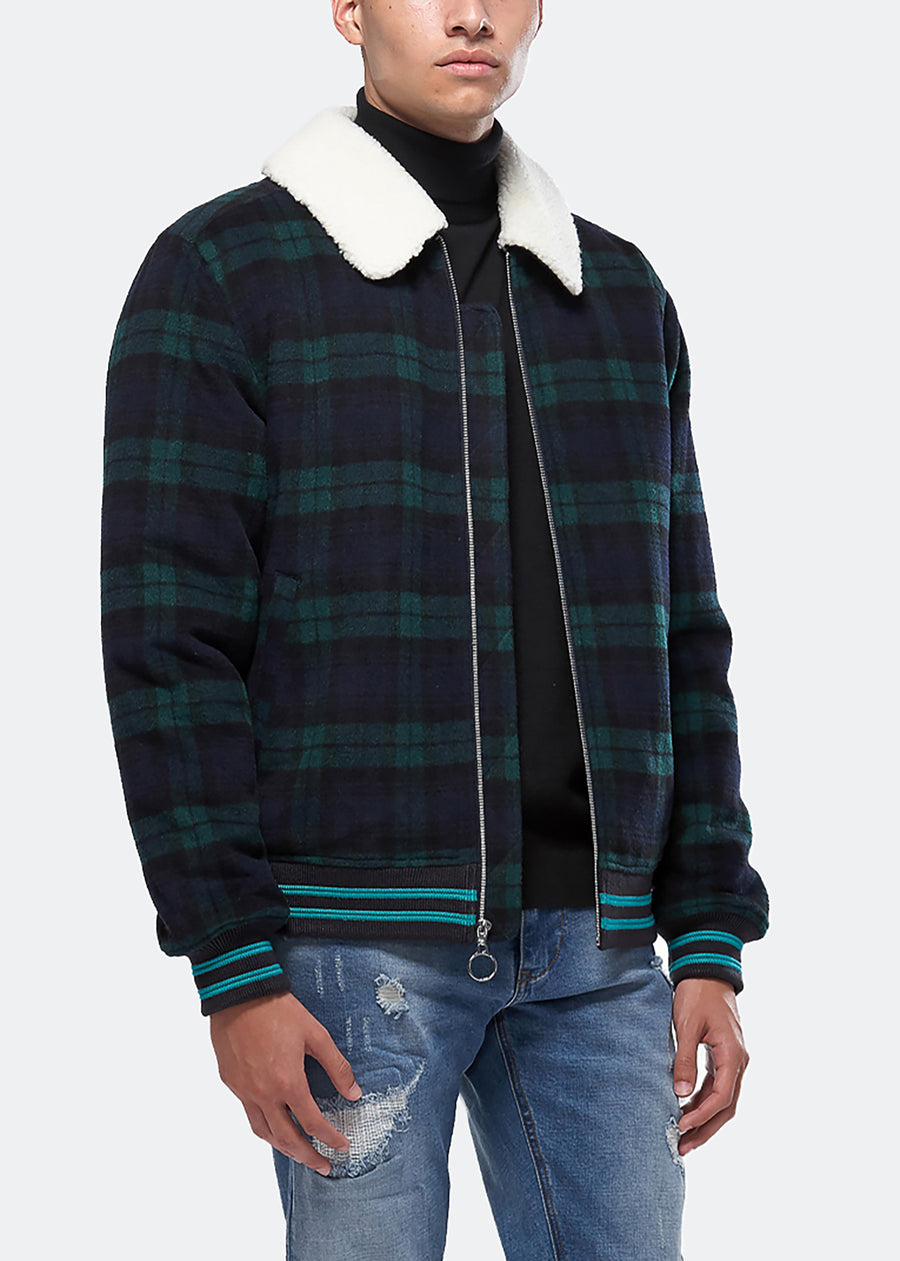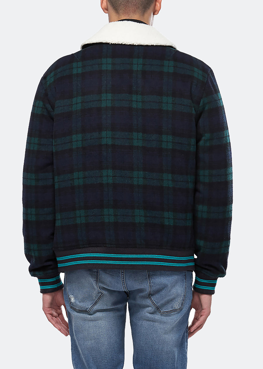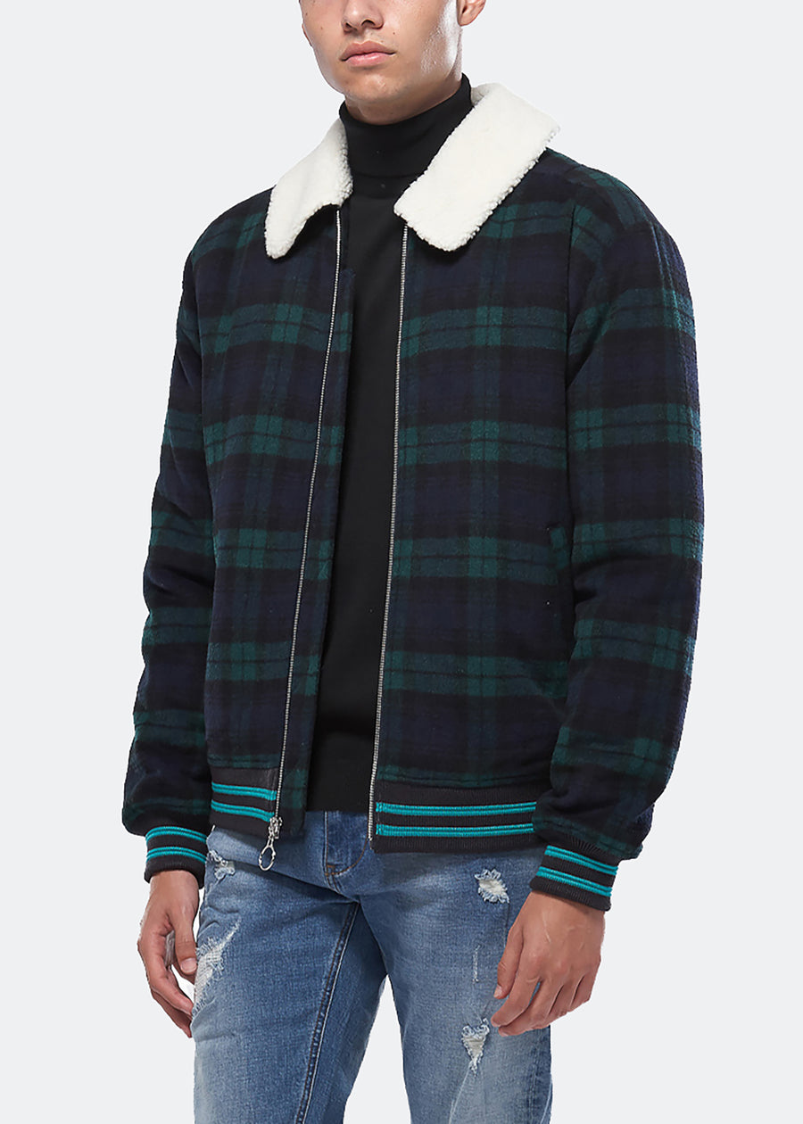 Wool blend plaid zip-up jacket with sherpa collar features welt hand pockets, striped ribbing at cuffs and waist