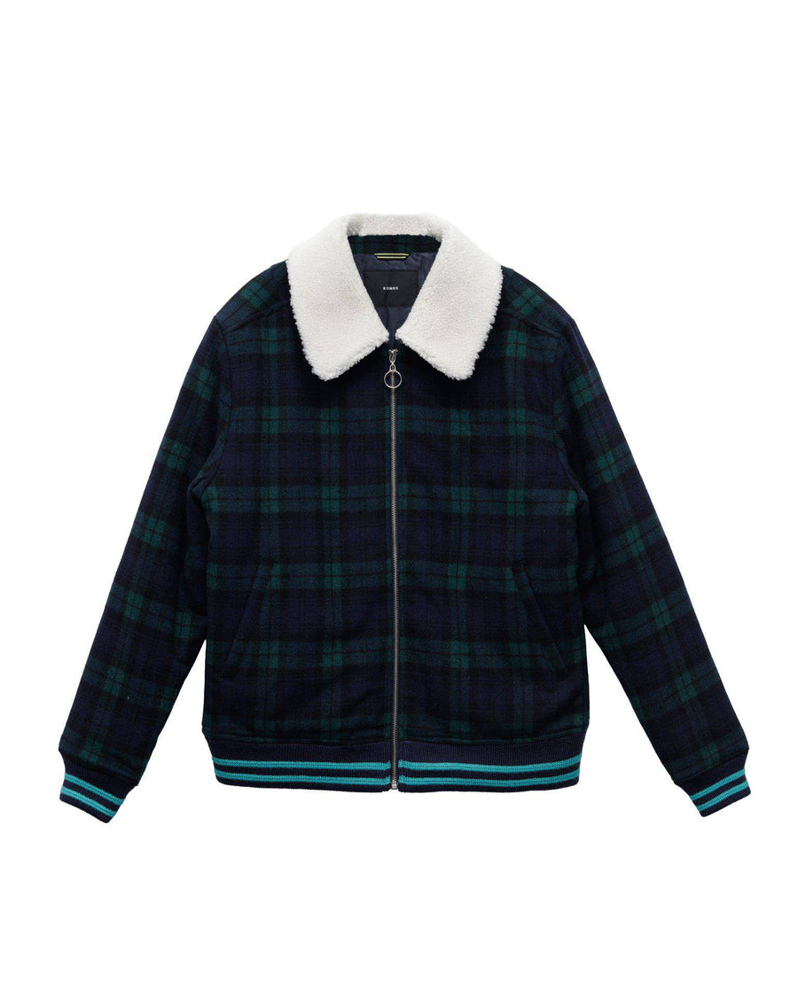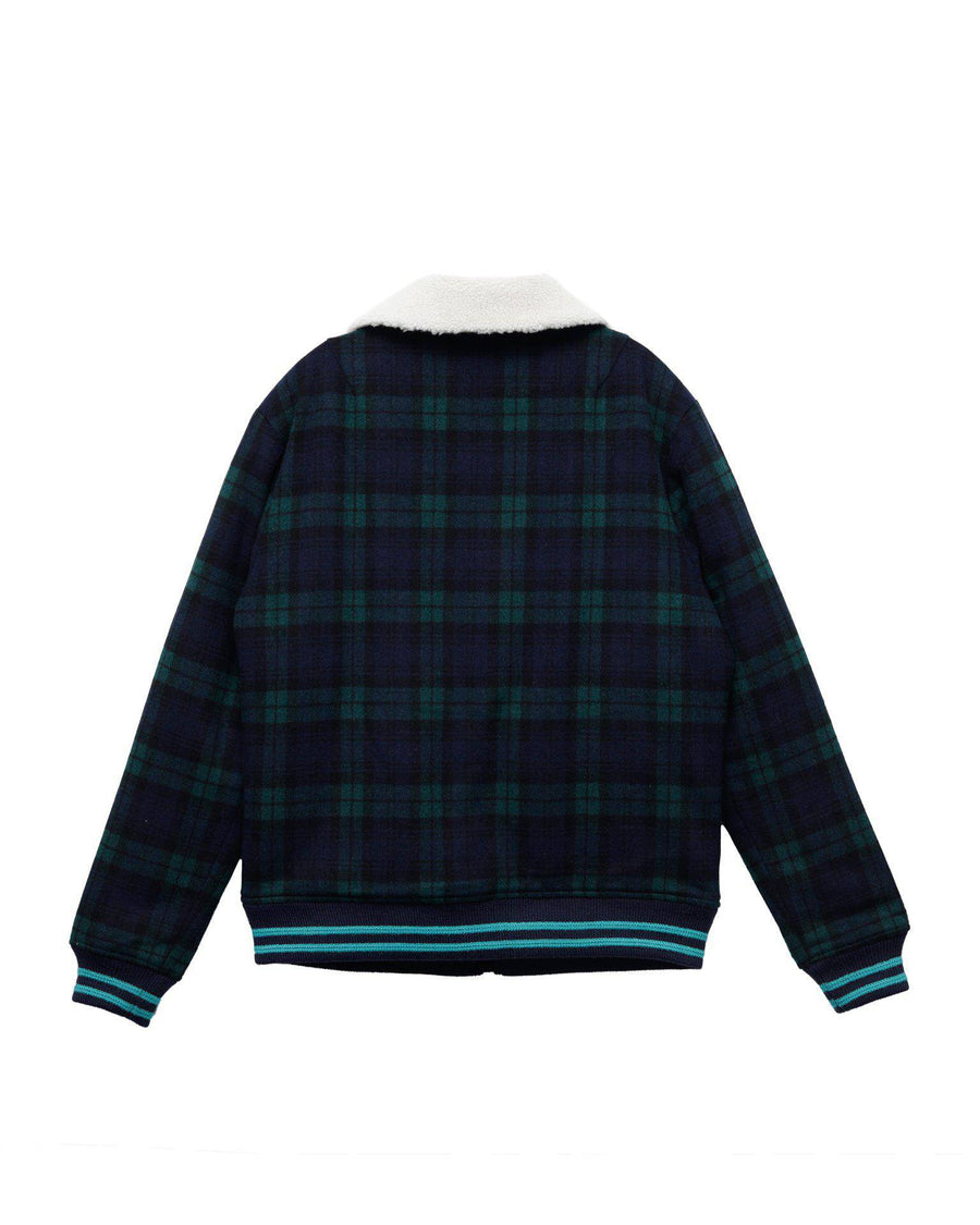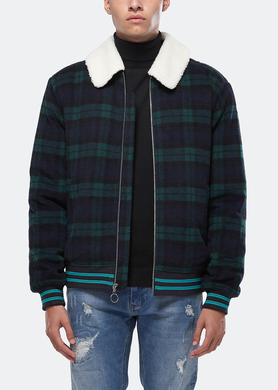 Wool blend plaid zip-up jacket with sherpa collar features welt hand pockets, striped ribbing at cuffs and waist
