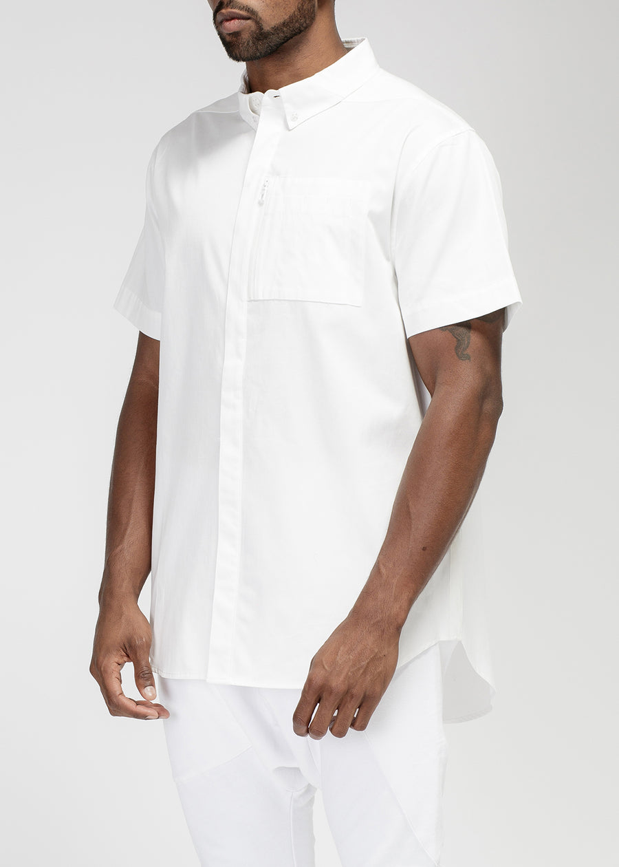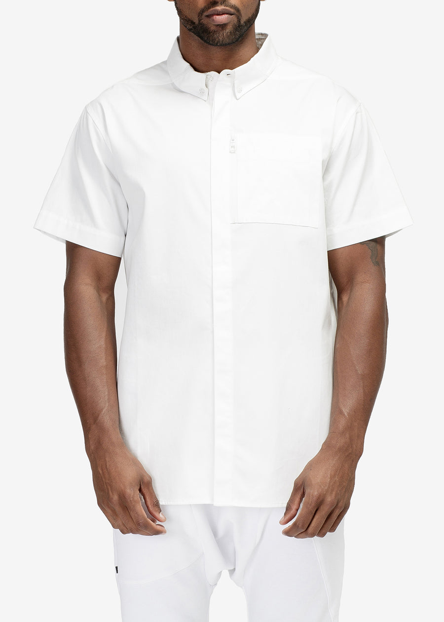 Features reflective tape on side seams for increased visibility. This short-sleeved button-down shirt also includes a convenient zipper chest pocket for added functionality.