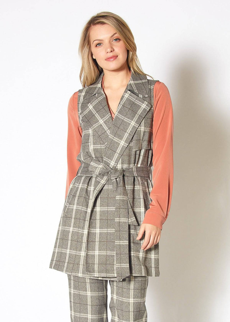 Pleione Women's Sleeveless Tie Waist Vest in Mocha Plaid