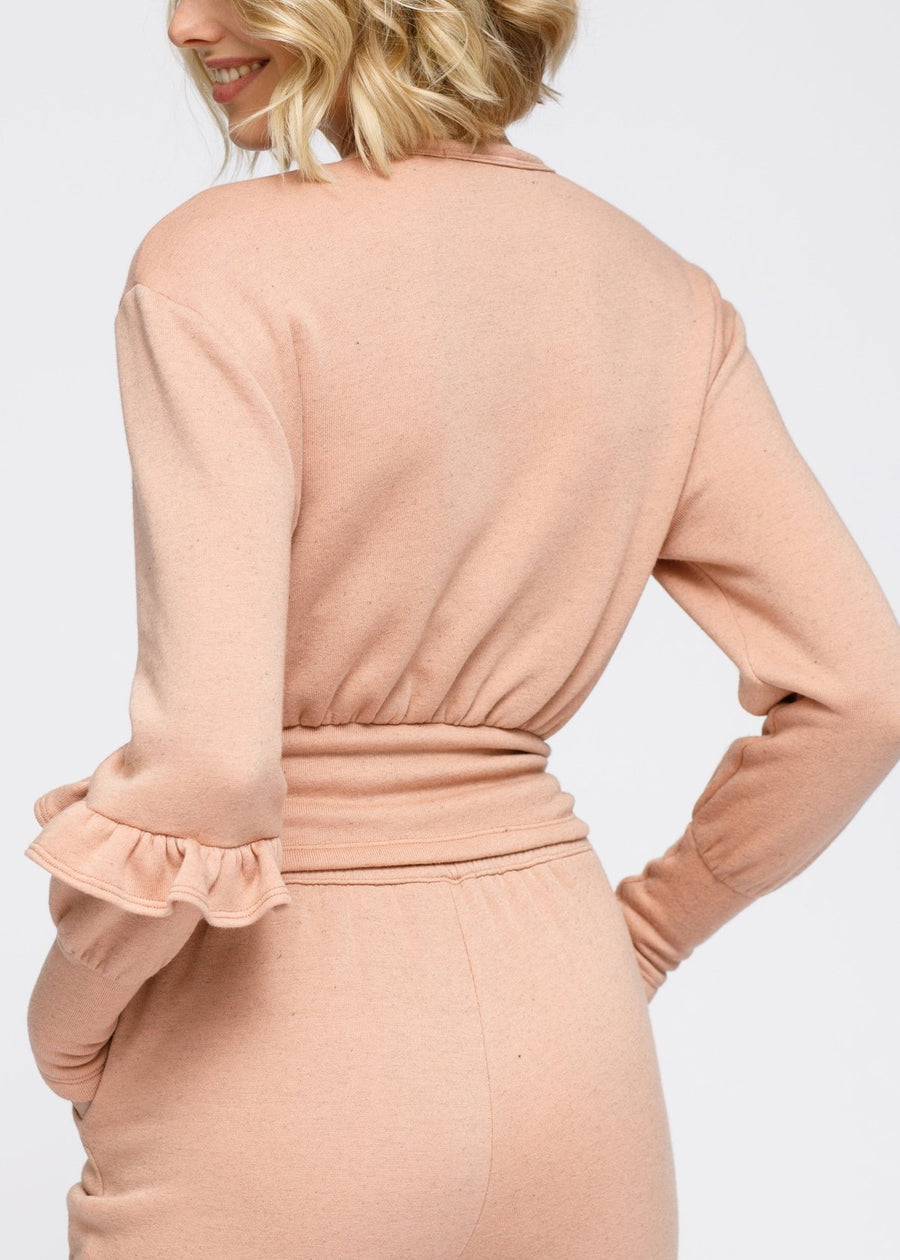 Brushed terry texture interior for comfort. Single ruffle sleeve. Elastic waist, crew neck, pull-on closure.