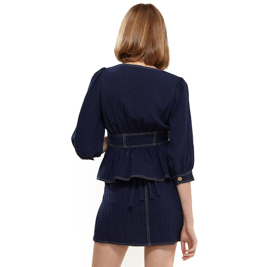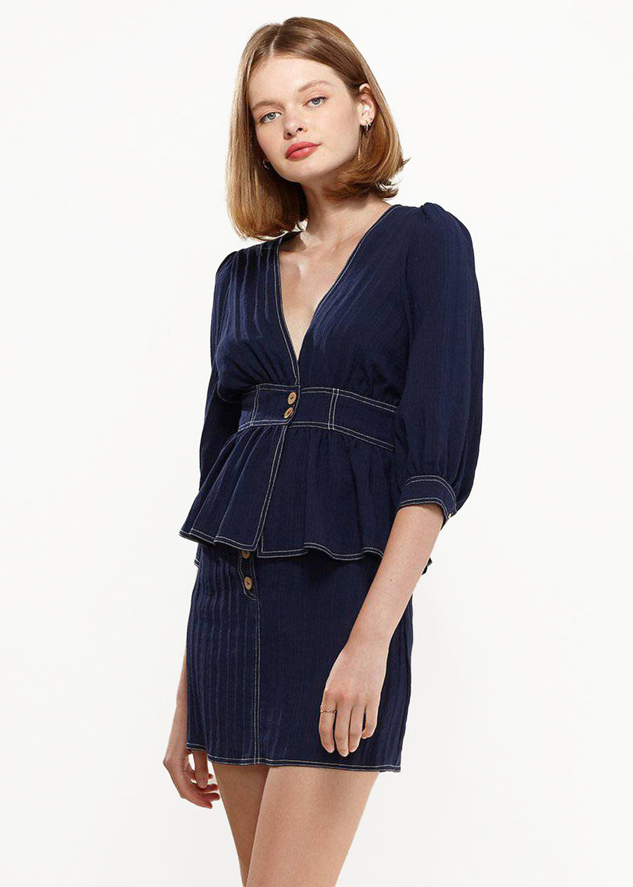 Women's Bishop Shoulder Button Front Peplum Top in Navy