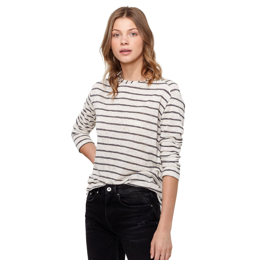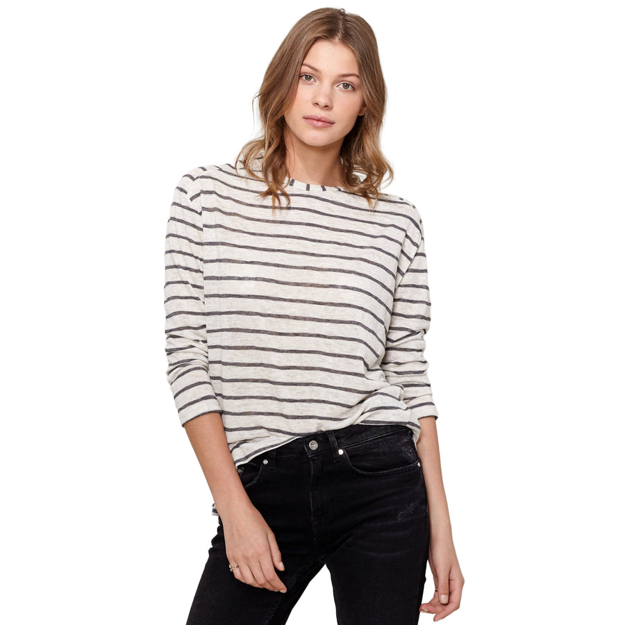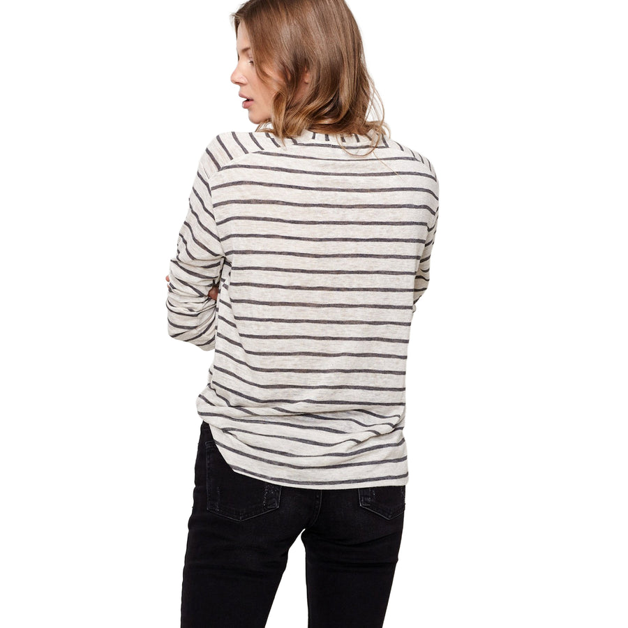 This exquisite top features a striking stripe pattern and boasts three-quarter sleeves with a Hi-lo silhouette and alluring side slits.