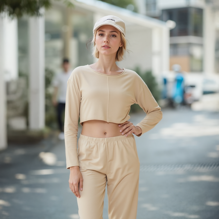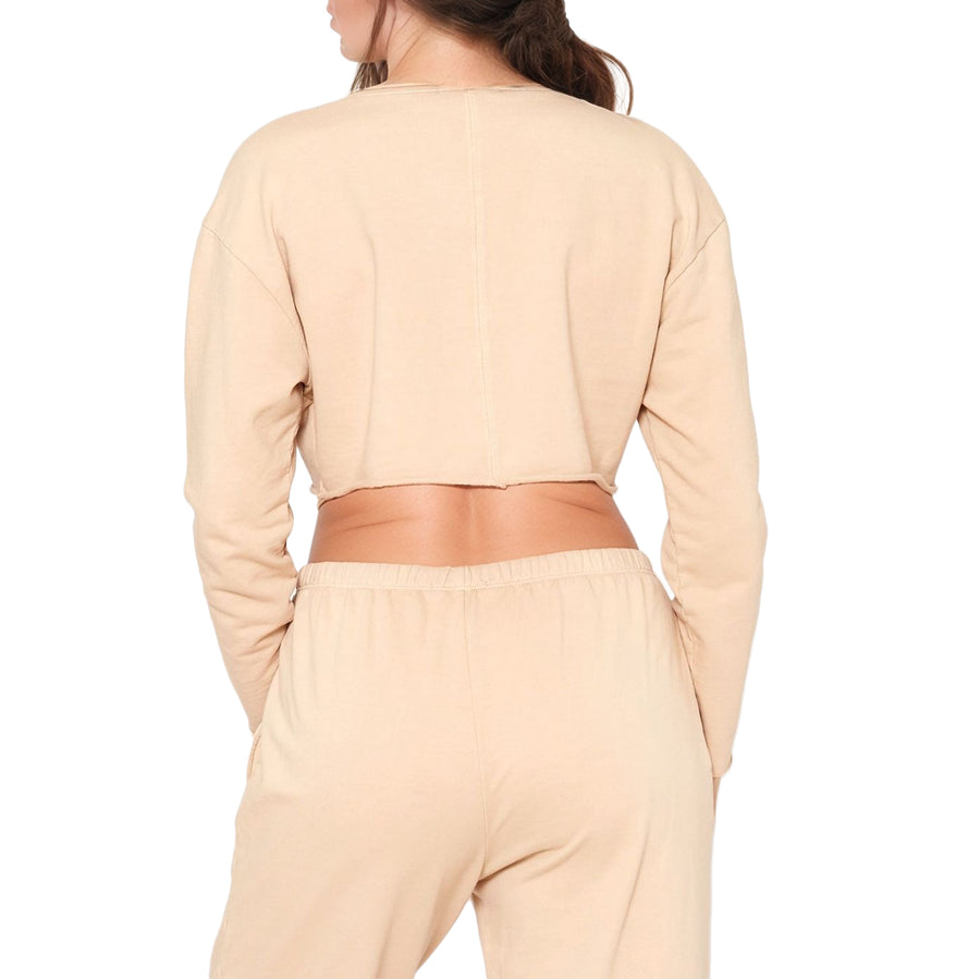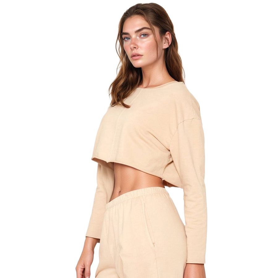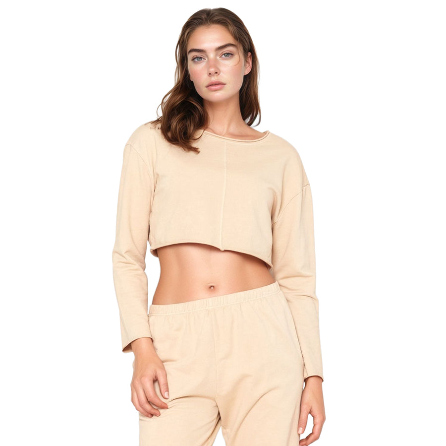 Introducing our women's garment dyed long sleeve French terry cropped sweatshirt top with a raw hem on the neck, arm, & bottom for a more casual and active fit.