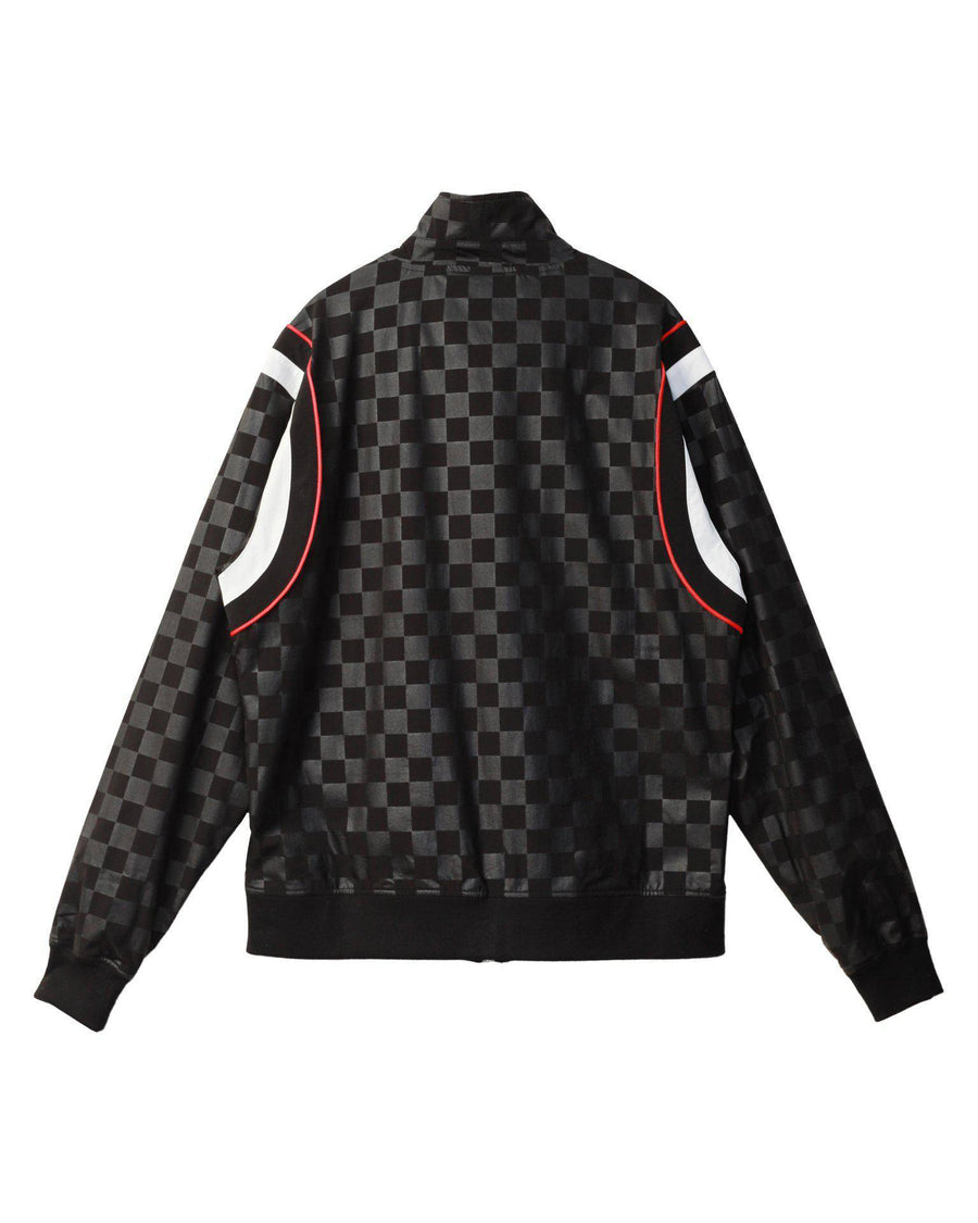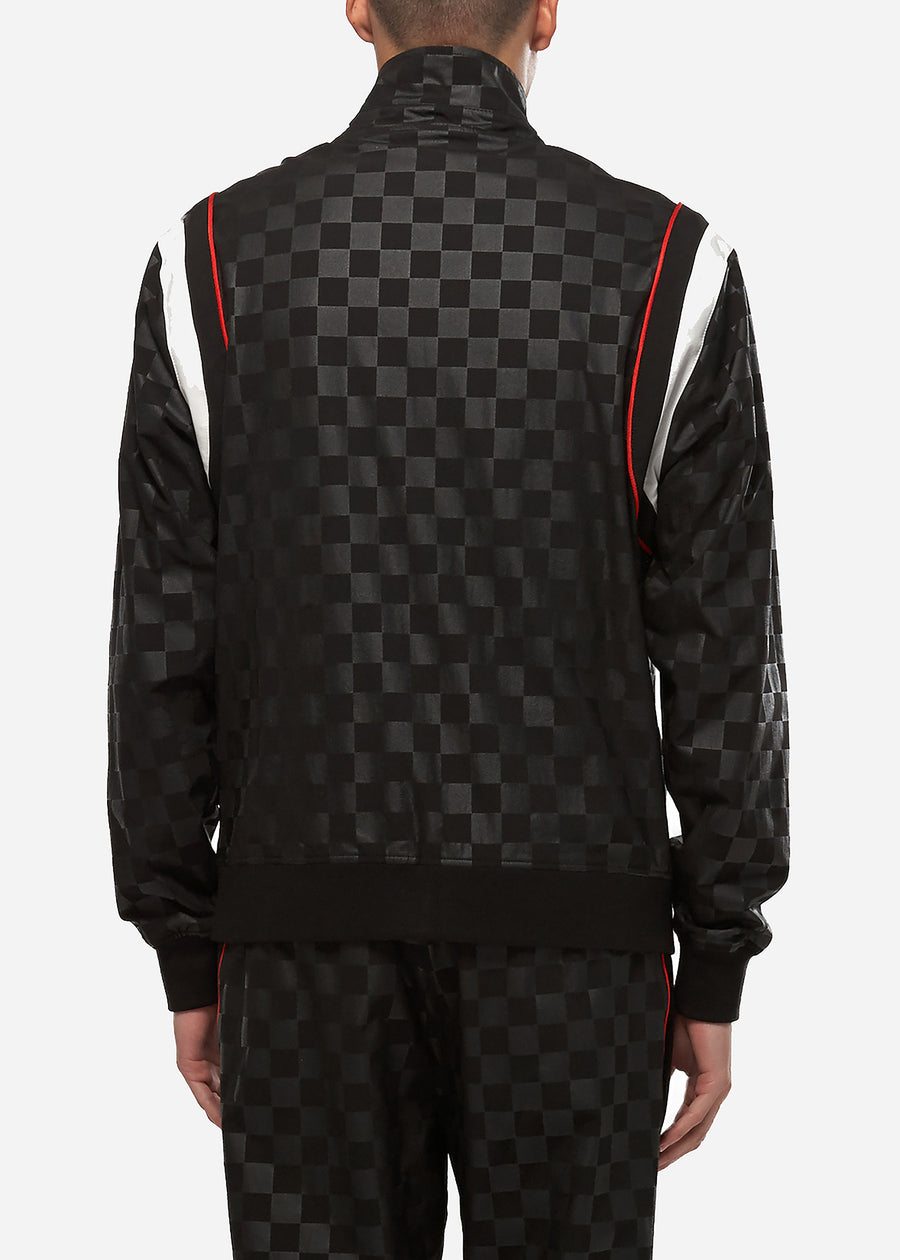 Windbreaker jacket in custom tonal checker printed fabric with contrast color fabric patch detail around armhole with red piping