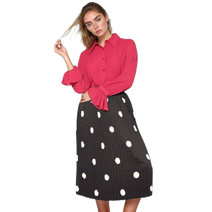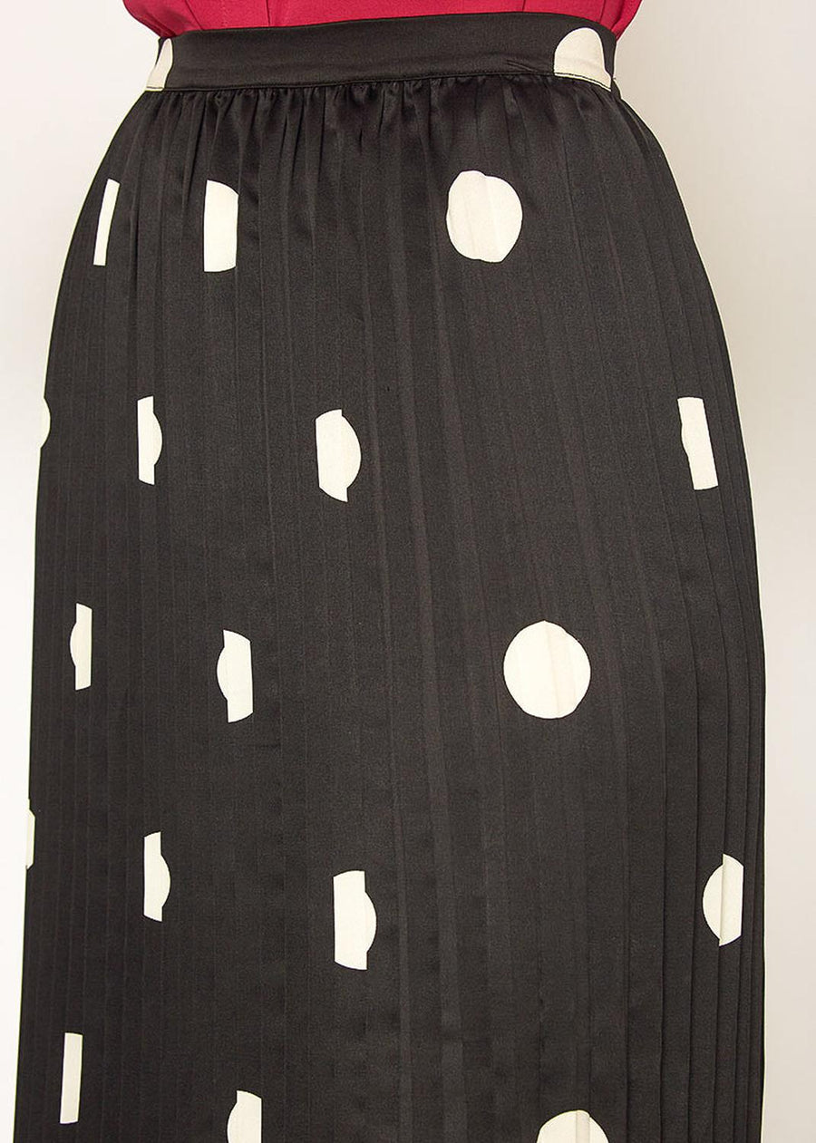 This women's midi skirt showcases a pleated silhouette adorned with a polka dot print and features an elastic waistband for added comfort. Made from matte satin fabric, it delivers a sophisticated finish.