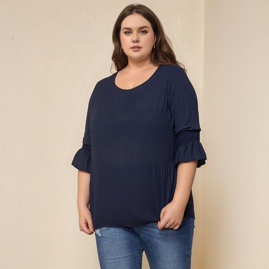 This blouse features playful pleats and a charming smocked 3/4 bell sleeve, complemented by a round neck and flat back design.