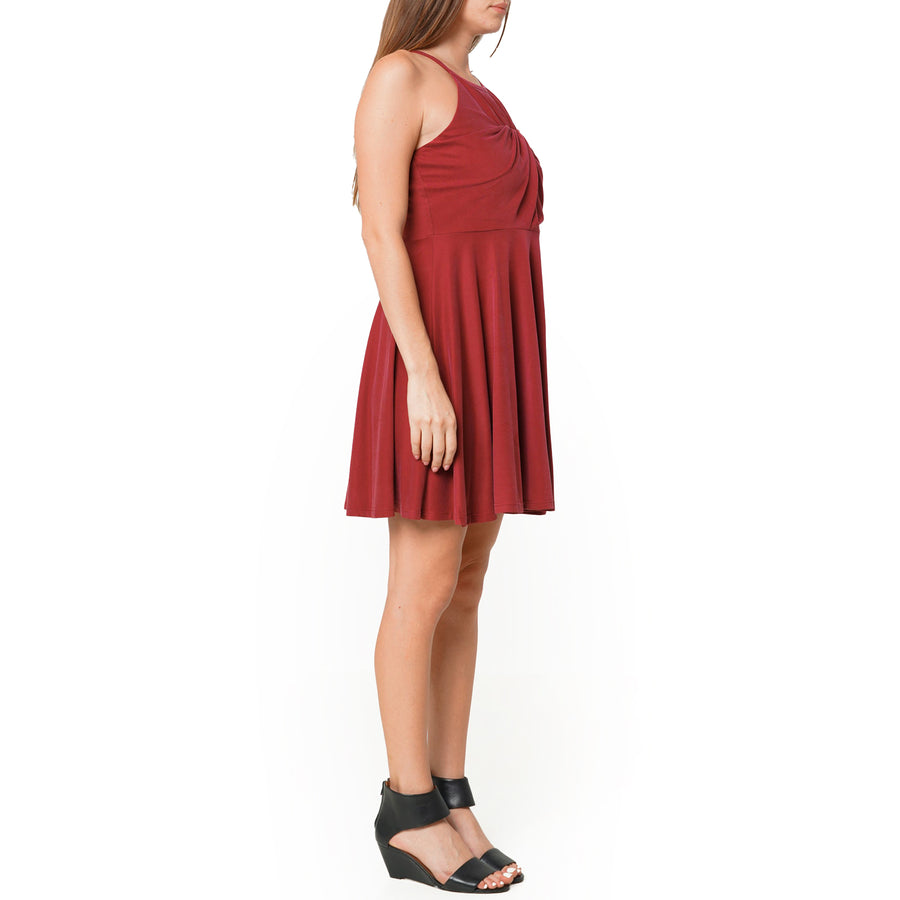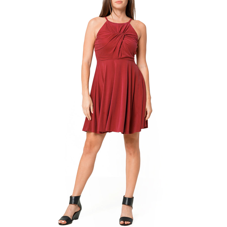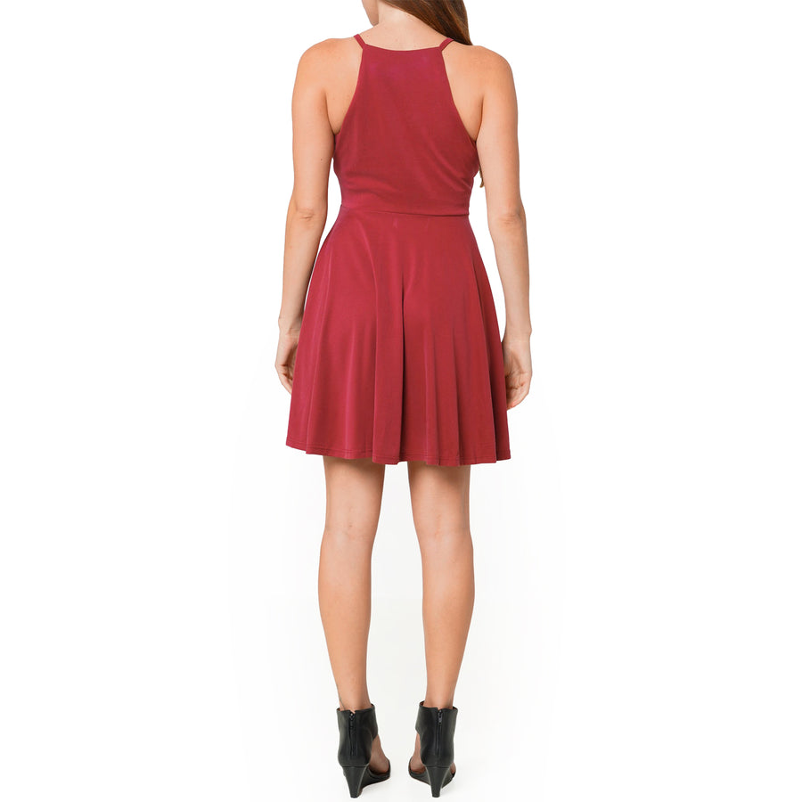 This timeless skater skirt dress features a unique halter neckline and a flattering gathered waist for an effortless look that works for any event.
