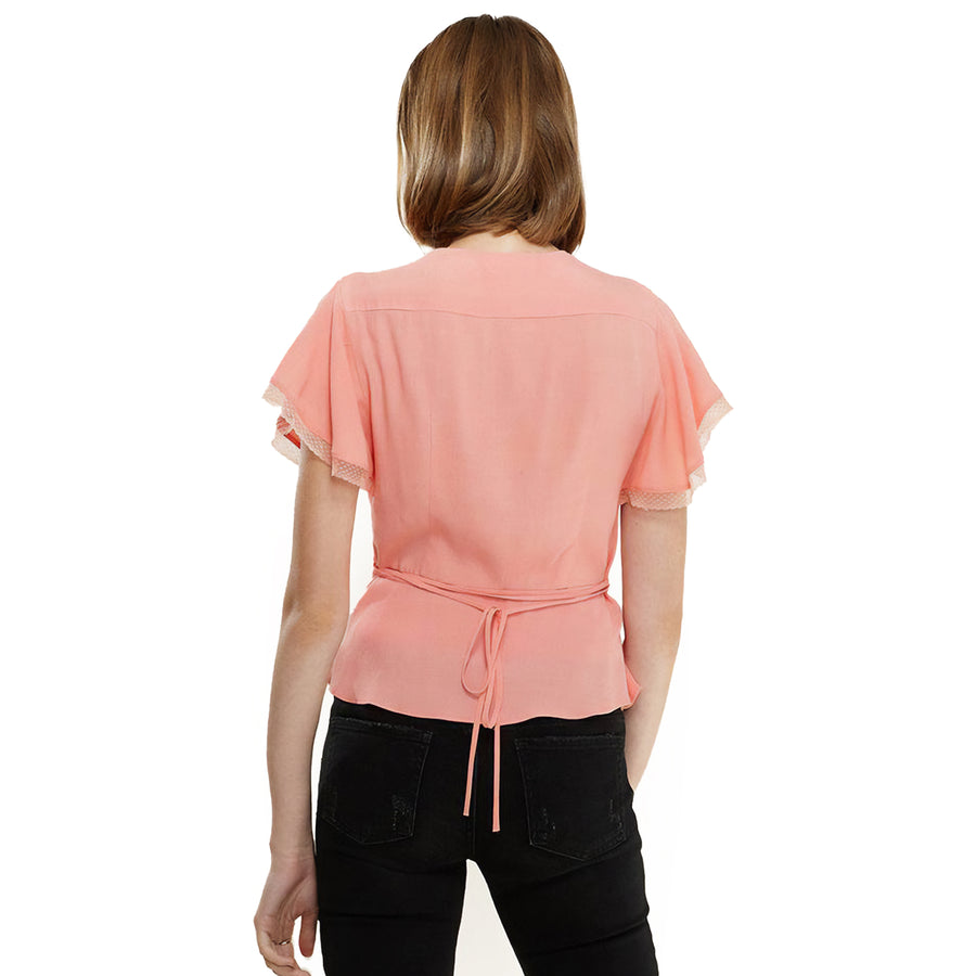 Women's Lace Trim Cape Sleeve Wrap Blouse in Coral