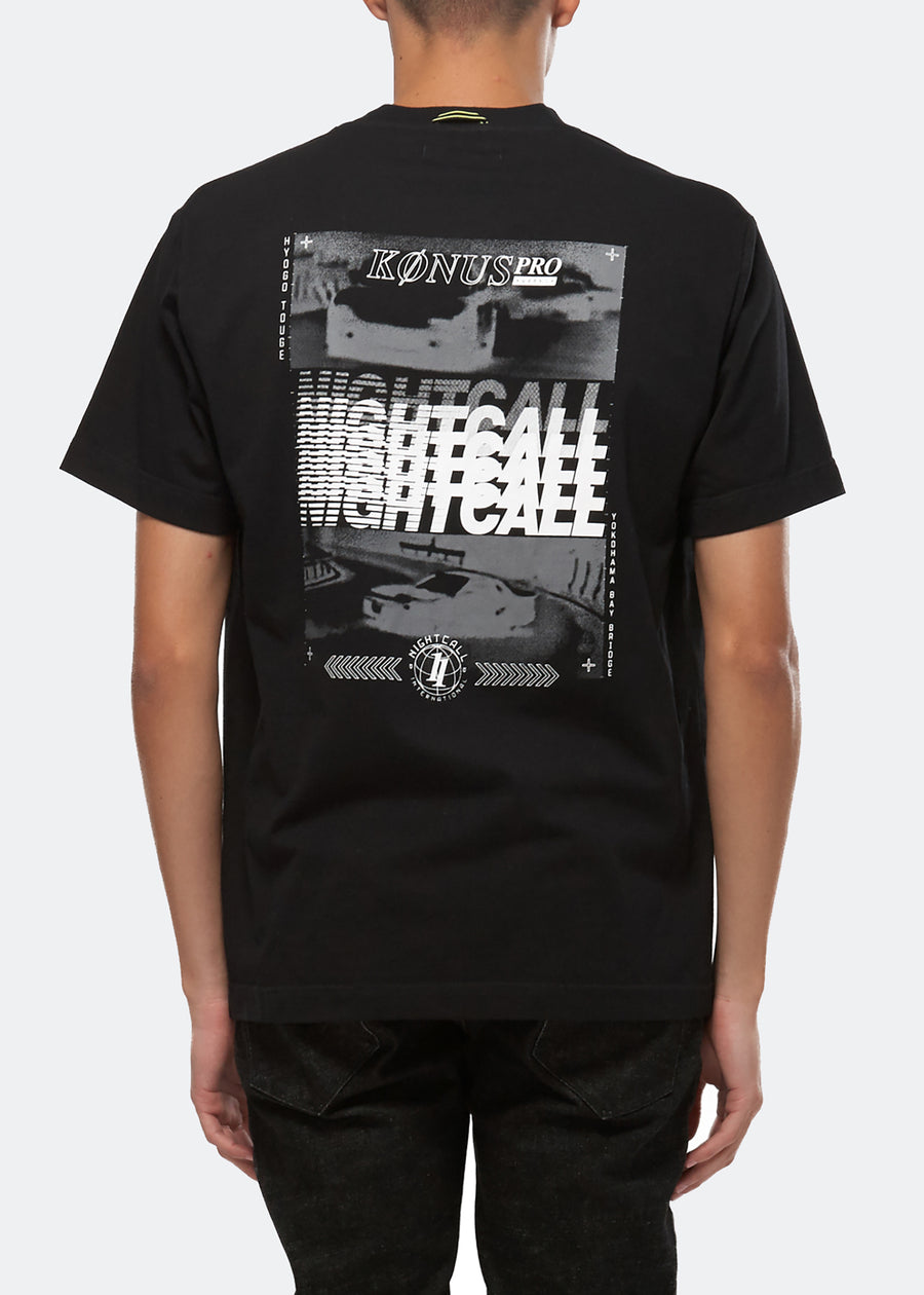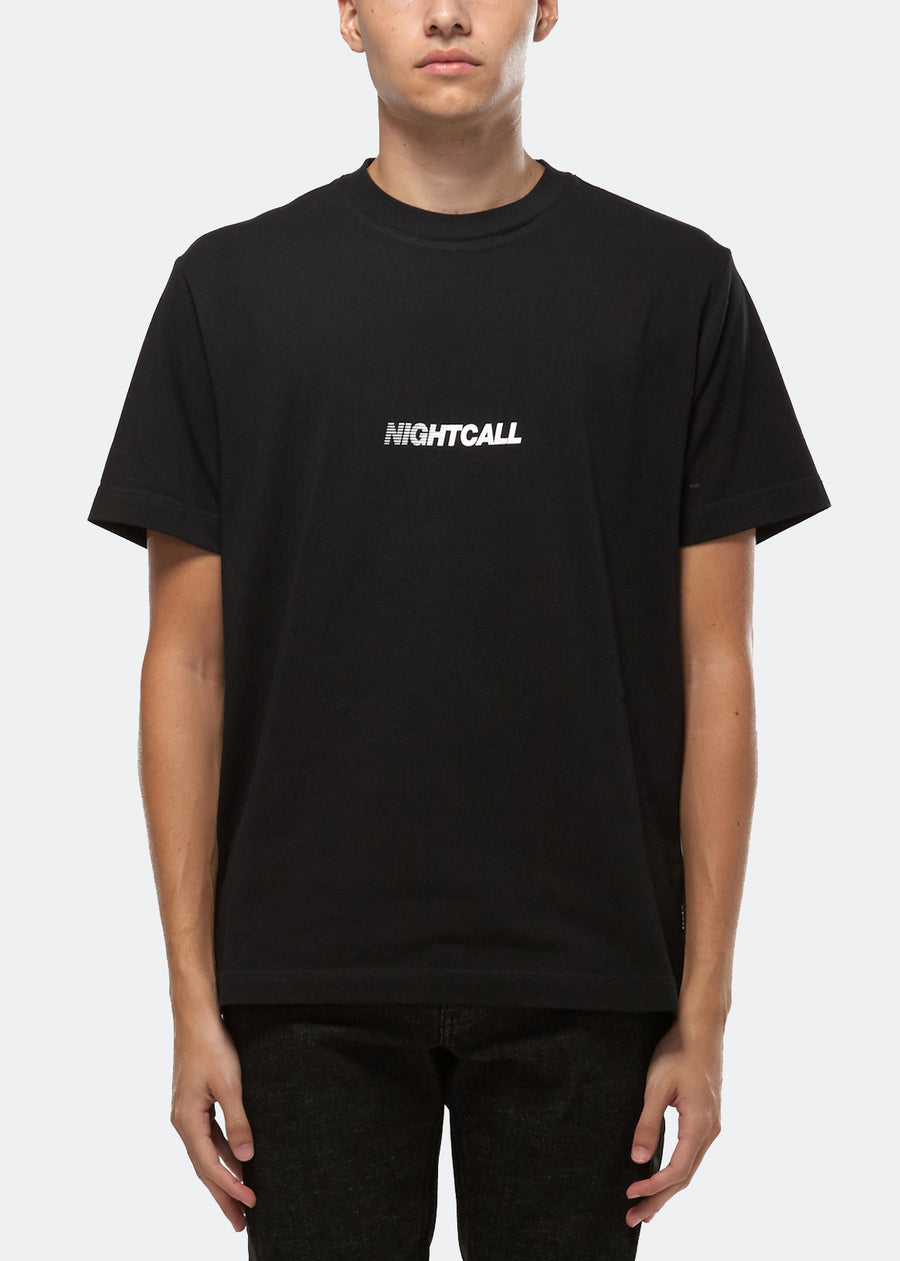 Short sleeve crewneck tee shirt with screen print on chest and back.