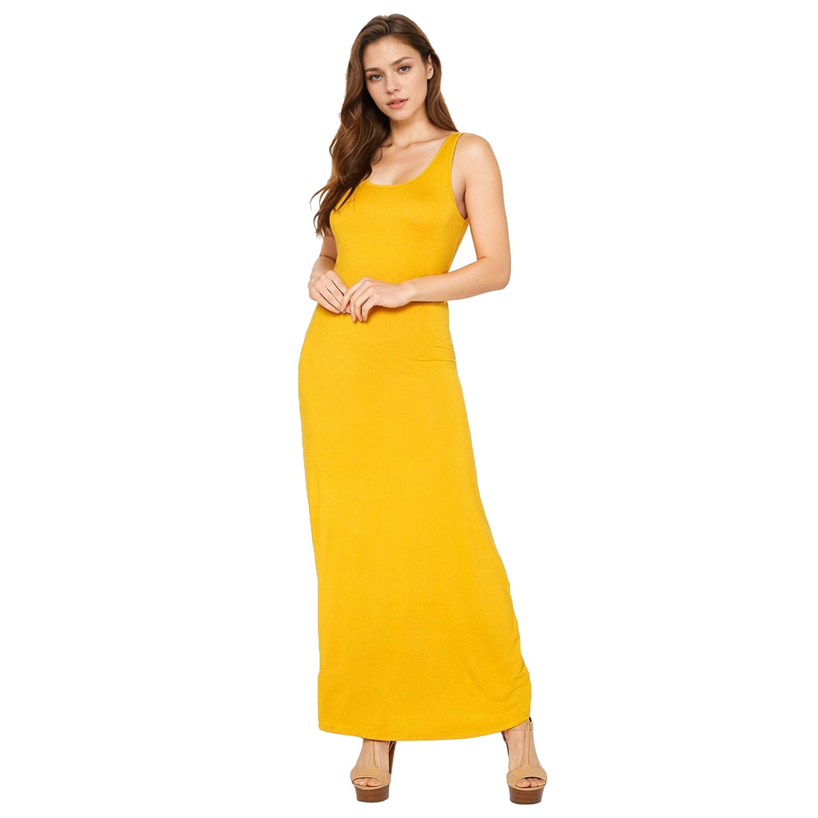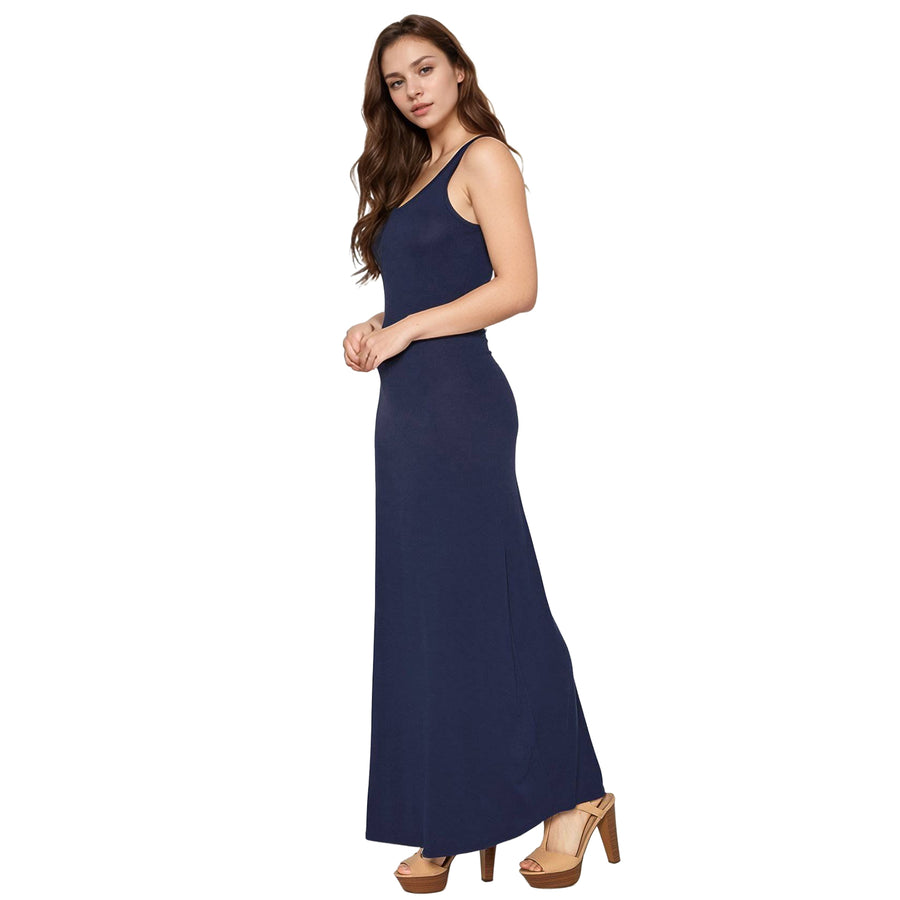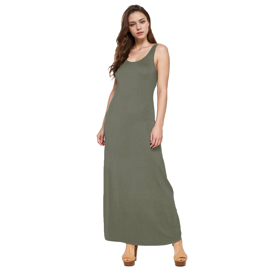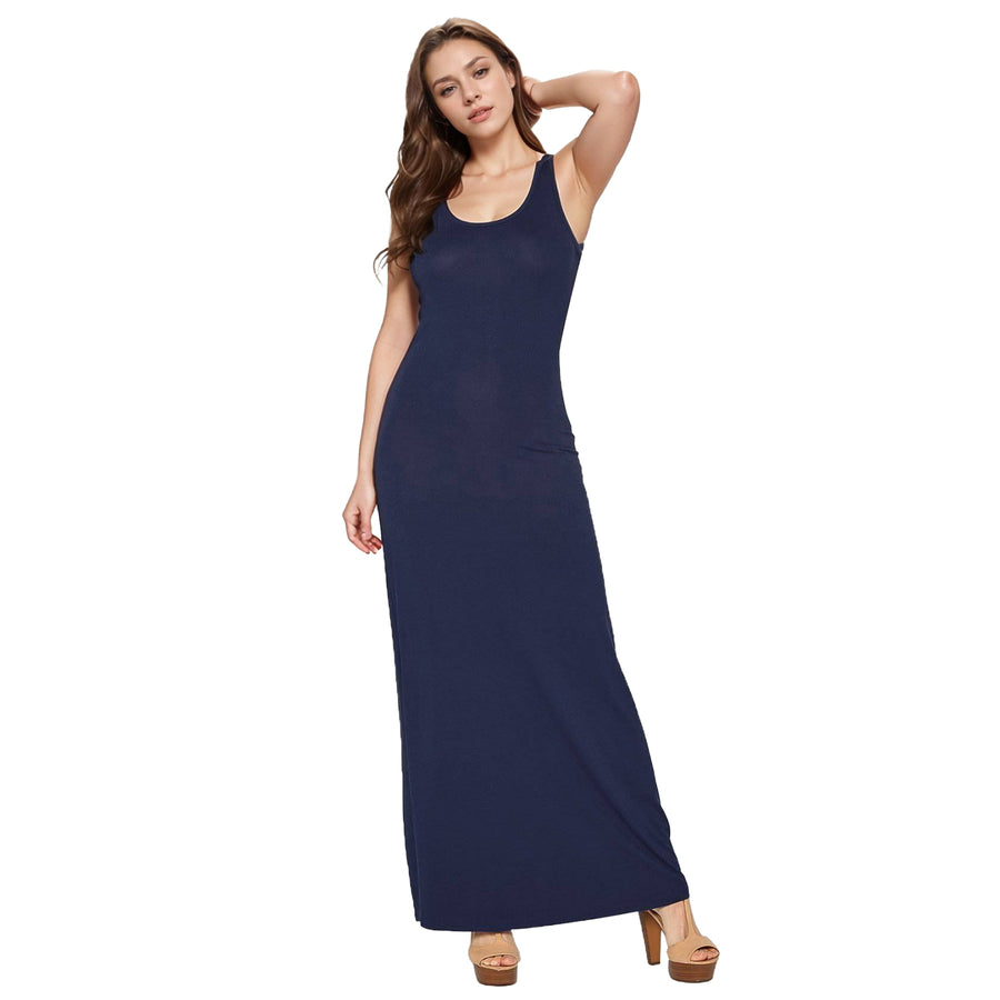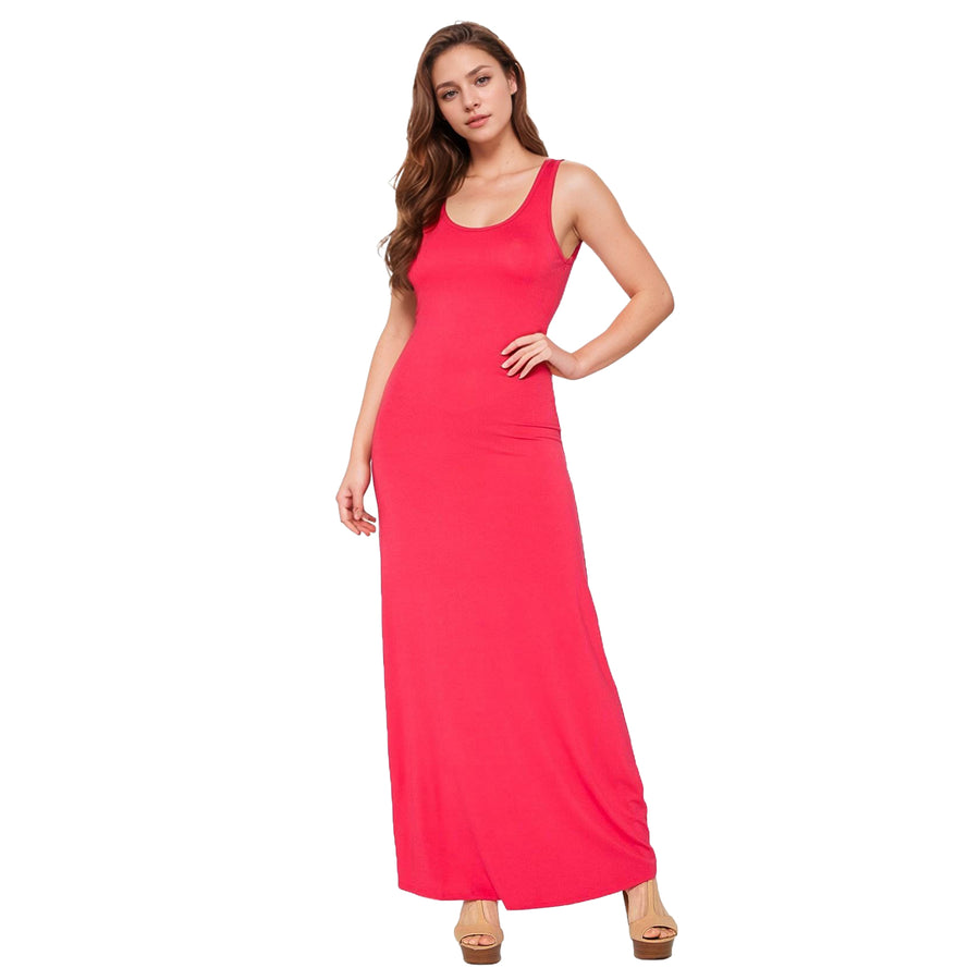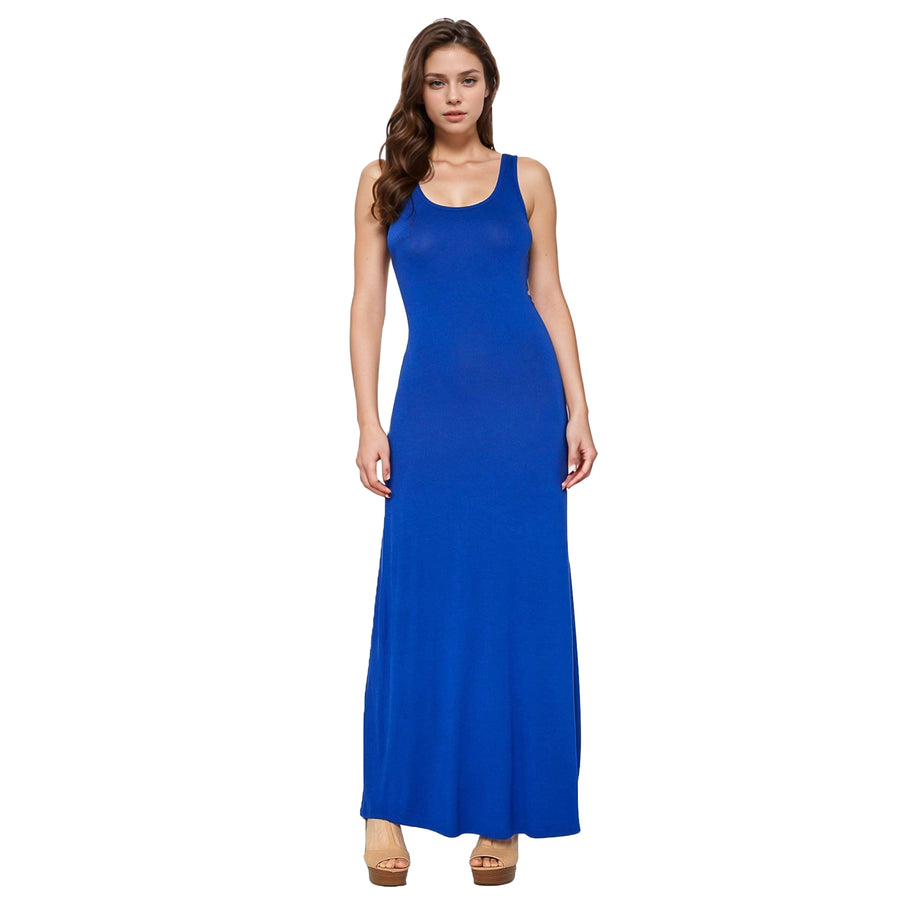 Unleash your daring side with our sleeveless scoop neck maxi dress. The basic scoop neck and sleeveless design will keep you cool, while the high-stretch material allows for freedom of movement. Available in solid colors, this dress is perfect for any risk-taking woman.